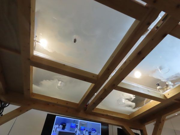 ショールームにある「雲の屋根」。ボタンを押すと、水の層が入った無色透明の天井にファインバブルの雲が出現して日陰を作る仕組みになっています。