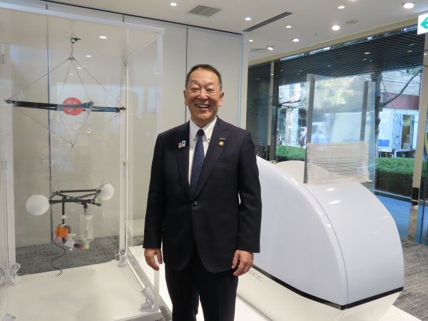 サイエンスホールディングス代表取締役会長、2025年日本国際博覧会大阪パビリオン理事の青山恭明さん。同社ショールームで撮影。後右には「ミライ人間洗濯機」のモデル機、後左には「宇宙シャワー」の実験で使用した機器がディスプレーされています。