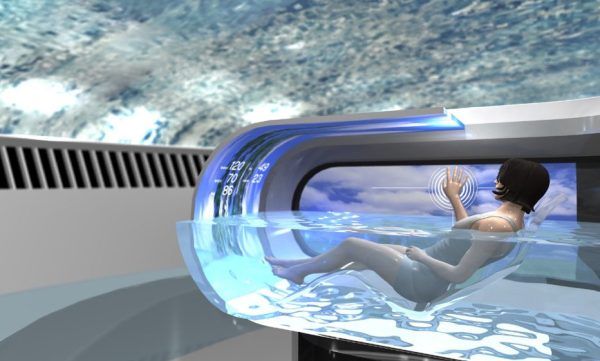 流線形のカプセルに入ると、体を洗浄すると同時に、背面のセンサーで脈動などを図り、その人のその時の状態に合わせて、リラックス&リフレッシュできる空間を作り出して提供します。