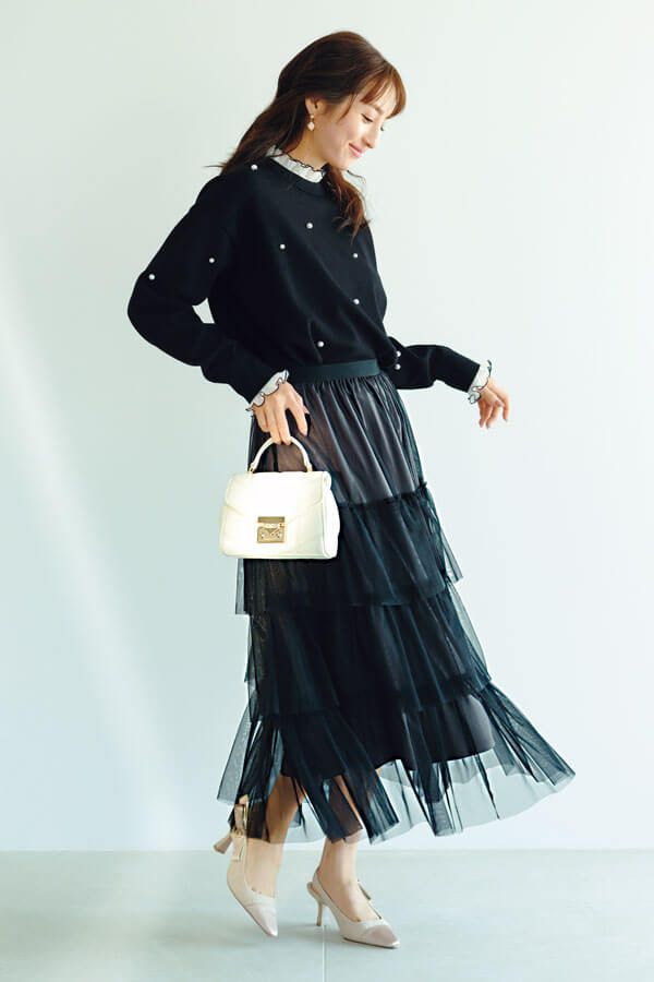 ブラックの割合が多い分、小物をホワイトにすることで、コーデ全体の糖度がアップ。トレンドのチュールが甘すぎて手が出しにくい人も、ブラックなら大人っぽく着こなせます。