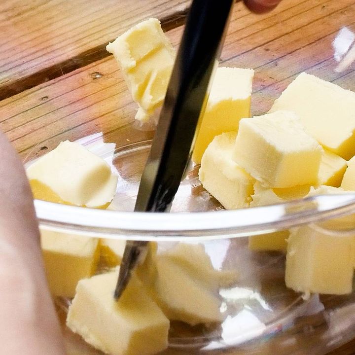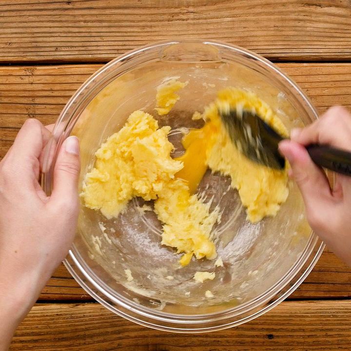1: ボウルにバターを入れて練り、粉砂糖を加えて混ぜ合わせます。