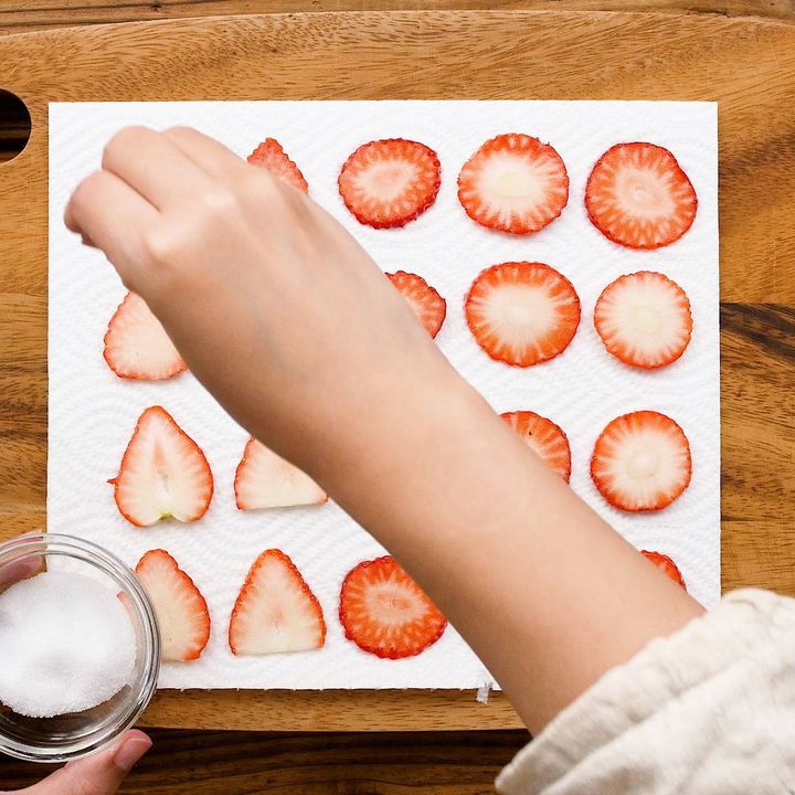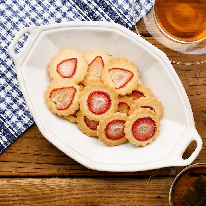 7: ④にいちごを1枚ずつのせ、150℃のオーブンで30分焼きます。粗熱がとれたら完成です。