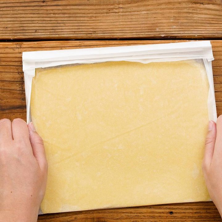 3: 粉気がなくなってきたらひとつにまとめ、クッキングシートにのせて厚さ3mm程度まで伸ばして冷蔵庫で休ませます。