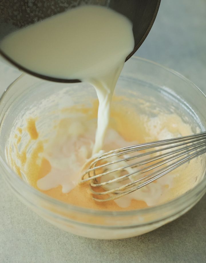★加熱した牛乳を一気に加えるのはNG。卵黄に火が入ってかたまるので、2回に分けて加えて。
