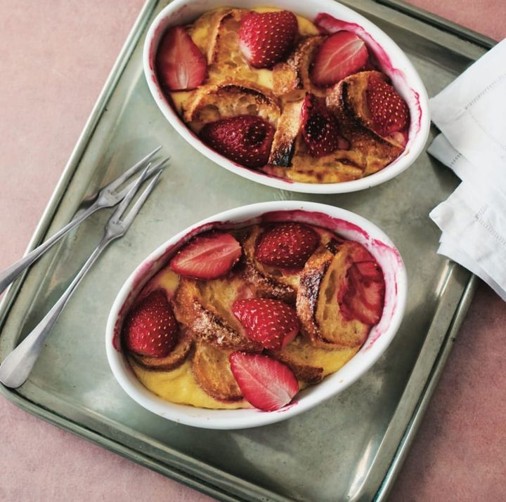 耐熱容器にのバゲットを先に敷き詰め、残りの卵液を流し入れる。いちごをのせてグラニュー糖を全体に薄くふり、オーブントーター(1000W)でこんがりと焼き色がつくまで15分ほど焼く。