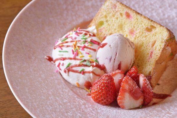 また、デザートには、店内で焼き上げられた、ふわふわ食感がたまらない「うかい」自慢のシフォンケーキに、苺や生クリームを添えて春らしい華やかさを演出した「苺のシフォンケーキ」を。春限定のスペシャルなデザートプレートですよ♪