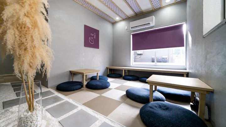 扉を開けると、波紋が描かれた白い玉石が敷き詰められていて、まるで京都のお庭のよう。靴を脱ぎ畳のタイルのうえでゆったりくつろげる癒やしの空間になっています。和モダンな雰囲気のインテリアは、すべてアメリカ出身のオーナー、ジェームズ・ブラウン氏が手掛けたものです。