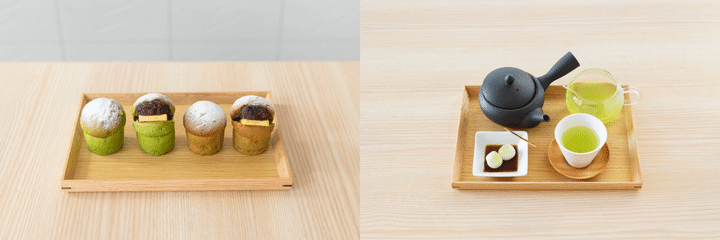 こちらは、練り切りとお茶の和菓子のセット。お茶は、「天然玉露 朝霞」「SHIEN茶」「しずく茶」「無農薬ほうじ茶」「無農薬アールグレイ茶」の5種類から選べます。すべて佐賀県の嬉野茶を使用。練り切りは、江戸の老舗和菓子店「榮太樓總本鋪」のもの(味は季節による)。タイミングによっては何種類かあり、選ぶこともできるそう。