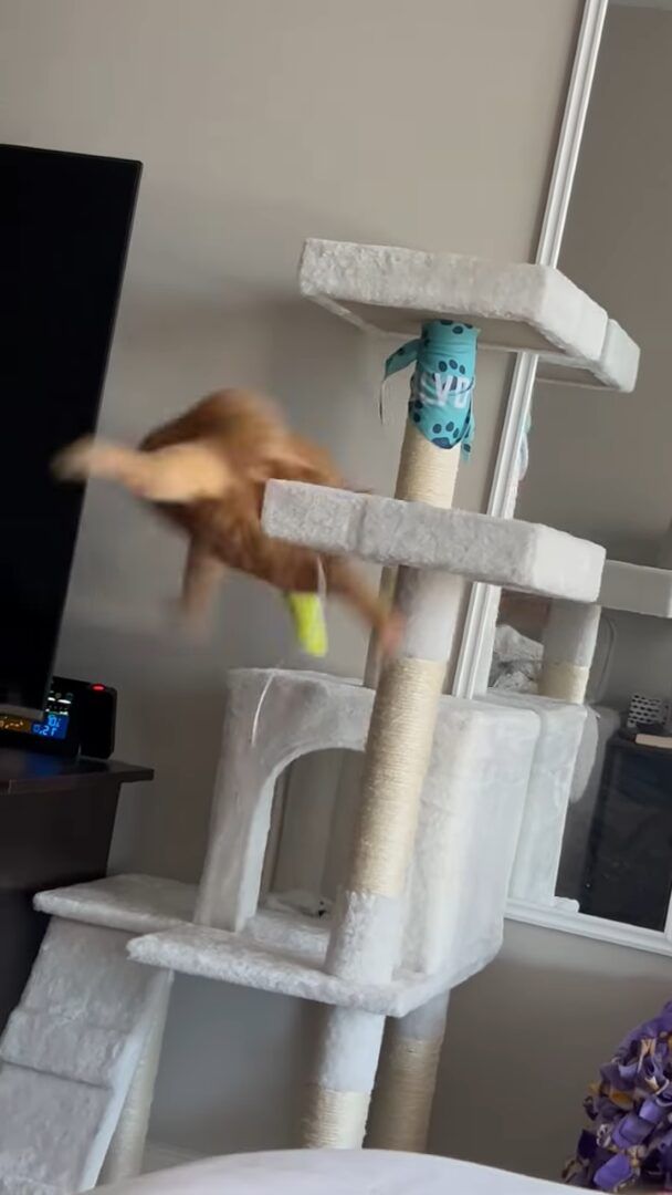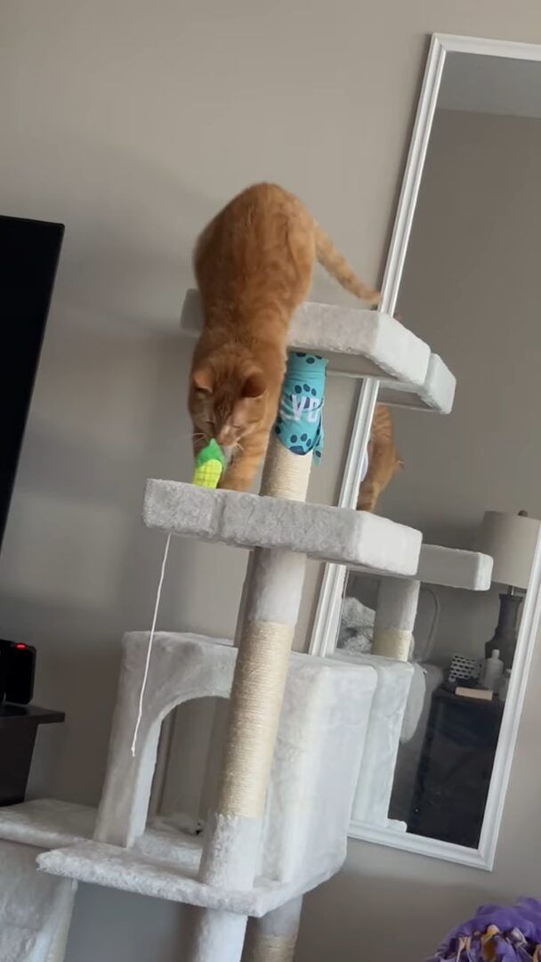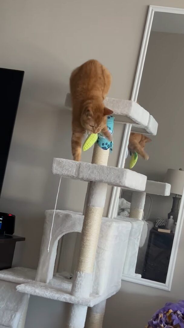 3. 遊んでいた猫にハプニング発生!キャットタワーの上でオモチャに夢中になっていたら・・【アメリカ・動画】
