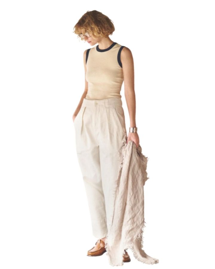 【POINT】アメスリ気味のタンクトップやメンズ風のローファーと合わせてもやんちゃに見えないのは好感度の高い白の効能。清潔感は白が担ってくれるから、女っぽさはアクセでとり入れるくらいで十分まとまる。