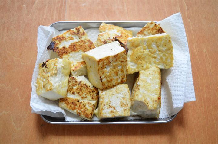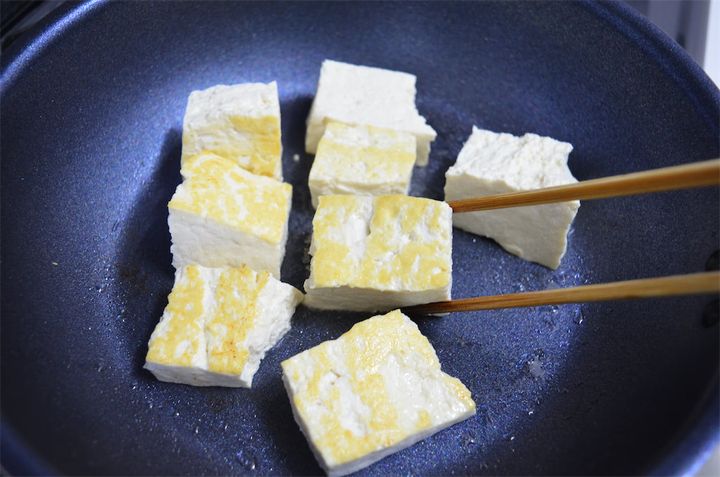 3.フライパンでサラダ油を熱し、手で大きめにちぎった豆腐を入れたら、色づくまで炒める。一度取り出して水分を切っておく。