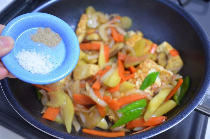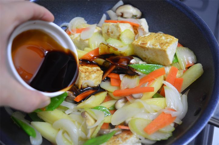 5.3の豆腐を戻して炒め合わせ、オイスターソース、酒を加え、塩とこしょうで味を整える。