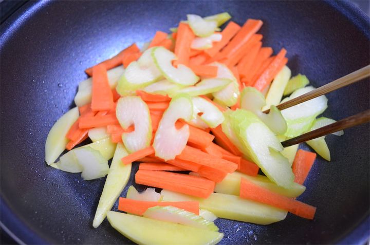 にんじん、新じゃがいも、セロリを先に炒めたら、
