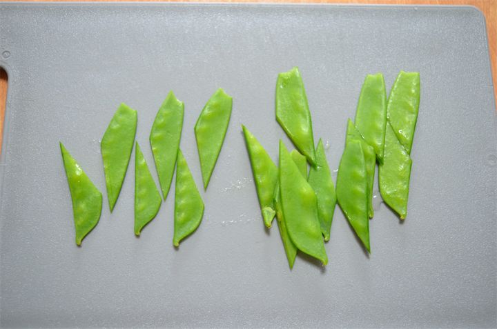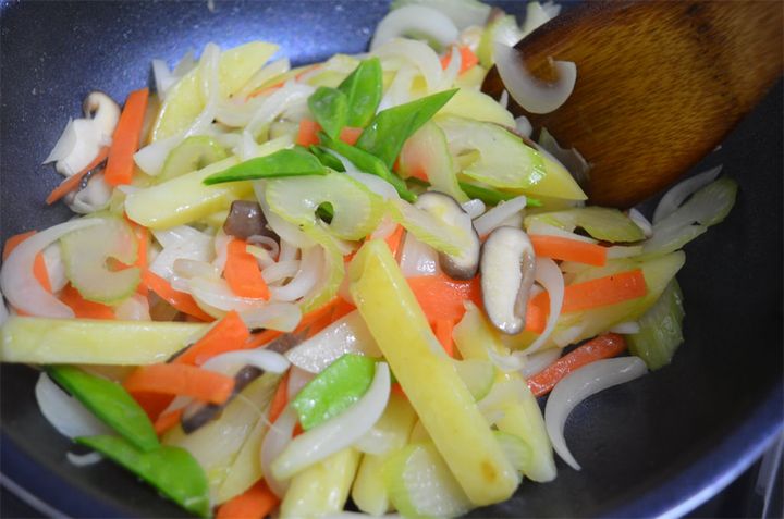 新玉ねぎ、しいたけの順に入れ、最後に絹さやを加えます。