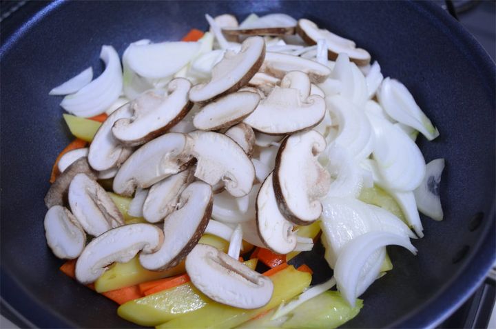 4.フライパンでサラダ油を熱し、硬めの野菜から順に加える。