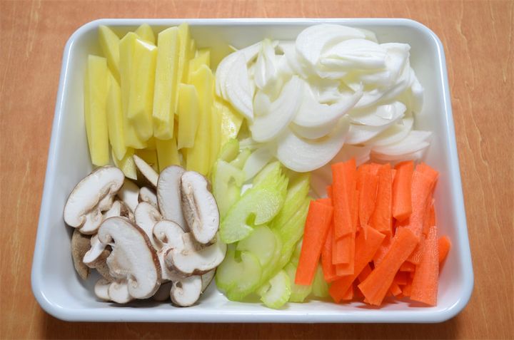 1.新じゃがいもは皮を剥いて太めの拍子木切り、にんじん、新玉ねぎ、しいたけ、セロリは薄切りにする。
