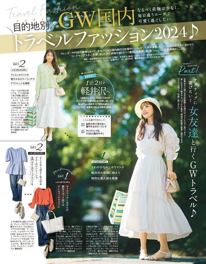今年のゴールデンウィークは国内旅行が人気! なるべく荷物は少なく、でも毎日違うコーデで可愛く旅をしたい……そんな要望にお応えする旅ファッションを、旅行先別にご紹介。