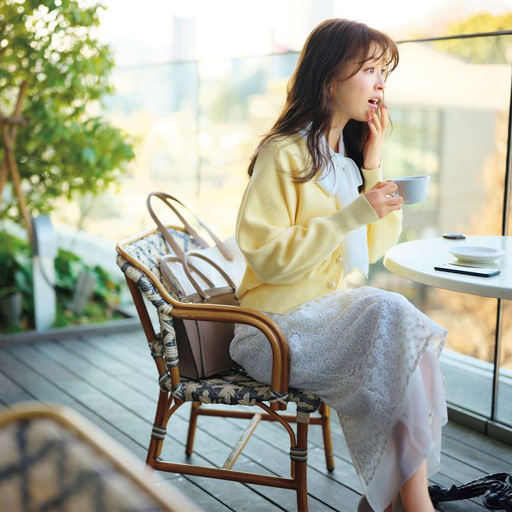 春の日差しに映えるイエローカーデは、テラス席で着映え度満点♪