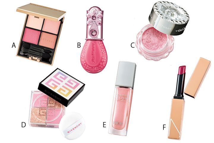 ローズ寄りのピンクを選ぶのがポイント。 A.クールなピンクと奥行きを演出するベージュのパレット。ルナソル アイカラーレーション 24 ¥6,820(カネボウ化粧品) B.どこまでも柔らかく馴染む桜の花びら色を、リップにもチークにも。ジルスチュアートサクラブーケ ブルームドロップ リップ&チーク シフォン 105 ¥3,300※数量限定 C.ぷるんとみずみずしくフィットするジュレアイカラー。ジルスチュアート エターナル アイビジュー 08 ¥2,970(ともにジルスチュアート ビューティ)D.ゴールドパールと透き通るピンクで春の光をまとうハイライター。ジバンシイ プリズム・リーブル・ハイライター 13 ¥6,930※数量限定(パルファム ジバンシイ)E.微細パールを帯びたピンクのツヤ&輝きが長時間続くリキッドハイライター。ディオールスキン フォーエヴァー グロウ マキシマイザー ピンク¥5,940※3月1日発売(パルファン・クリスチャン・ディオール)F.唇をツヤ&うるおいで満たすシアーなプラムピンク。NARS アフターグロー センシュアルシャイン リップスティック 226 ¥4,400(NARS JAPAN)