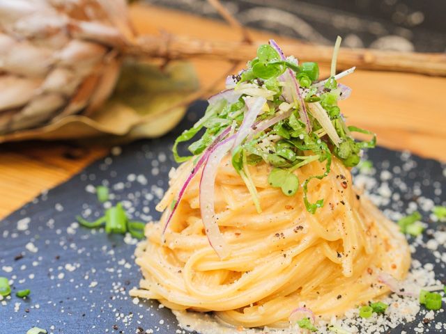 「博多明太と雲州味噌のクリームチーズソースパスタ」 味噌の隠し味もあるのでしょうが、どことなく和風でどこかしら安心するお味です。シニア人気が高いのも納得する美味しさです。明太のつぶつぶ感も楽しい一皿。こちらも発酵食品の味噌が使ってありますよ。