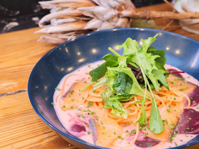 運気まで上がりそうな、ピンクのパスタこと「スモークサーモンと鮮やかビーツの塩麹レモンクリームパスタ」 色からして乙女心をくすぐりますが、さっぱりとしていてそれでいてサーモンの風味が効いていてクリーミーでまろやかで。ピンクの色味はビーツから。春らしい一品でした。塩麹が体にも優しいことでしょう。