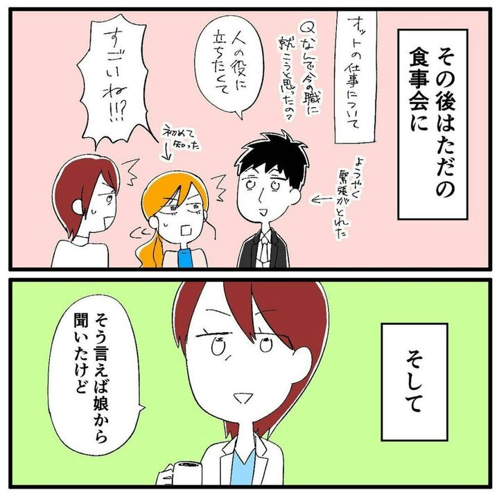 この漫画は、大好きな彼氏と結婚することを決めた高宮さん(@takamiya0501)が、離婚経験があり結婚に否定的な考えを持つ母親と衝突するも、自分の思いを母親にぶつけて幸せな結婚をつかみ取った実体験です。結婚のあいさつの冒頭で、高宮さんの母親は2人の結婚にあっさりとOKを出し、食事会がスタートしますが…。『結婚報告をしたら母と険悪になった話』第19話をごらんください。