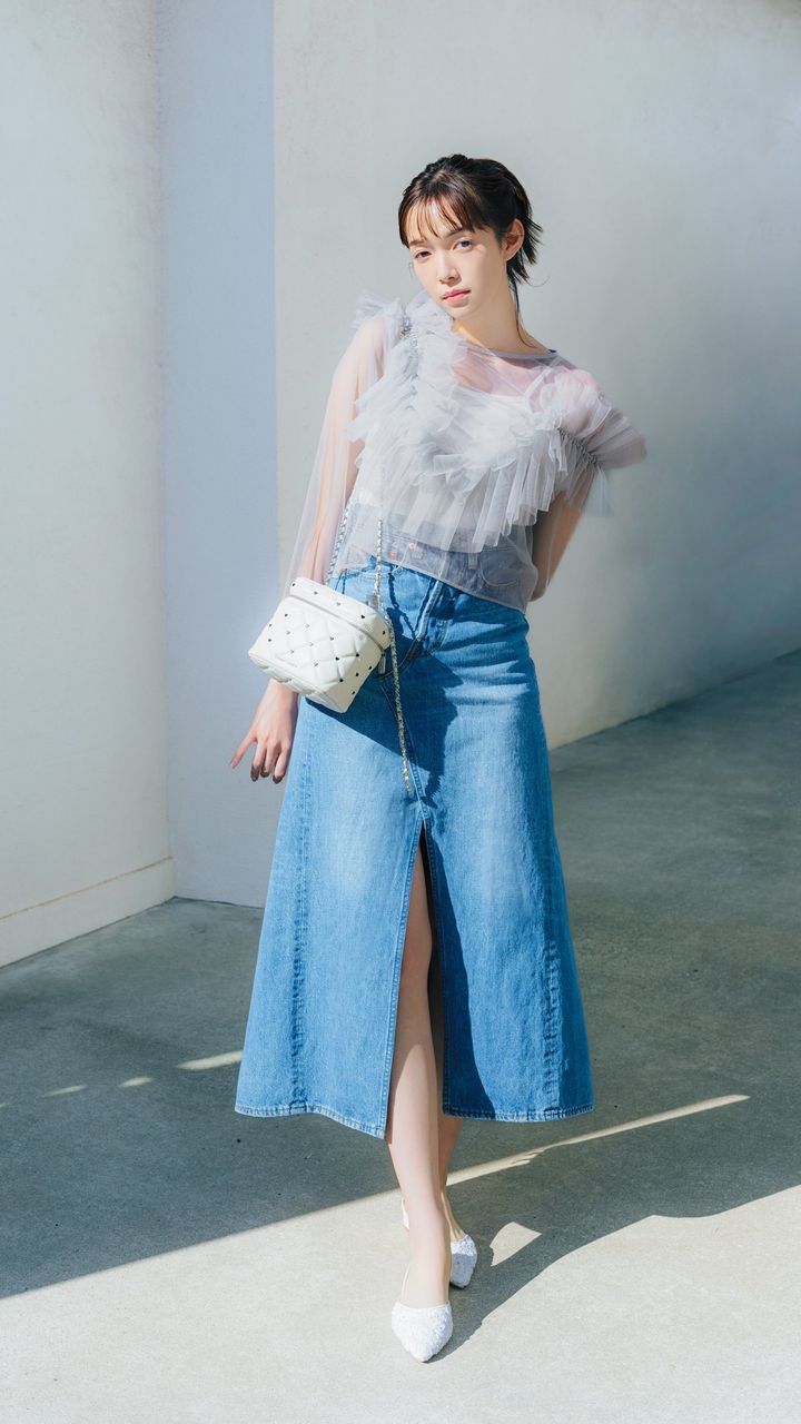 丈長め&ハイスリットのフレアなデニムスカートなら、上品な肌見せが叶ううえ、コーデに抜け感が出て◎。後ろは切りっぱなしデザインなのでほどよくラフな点も優秀。