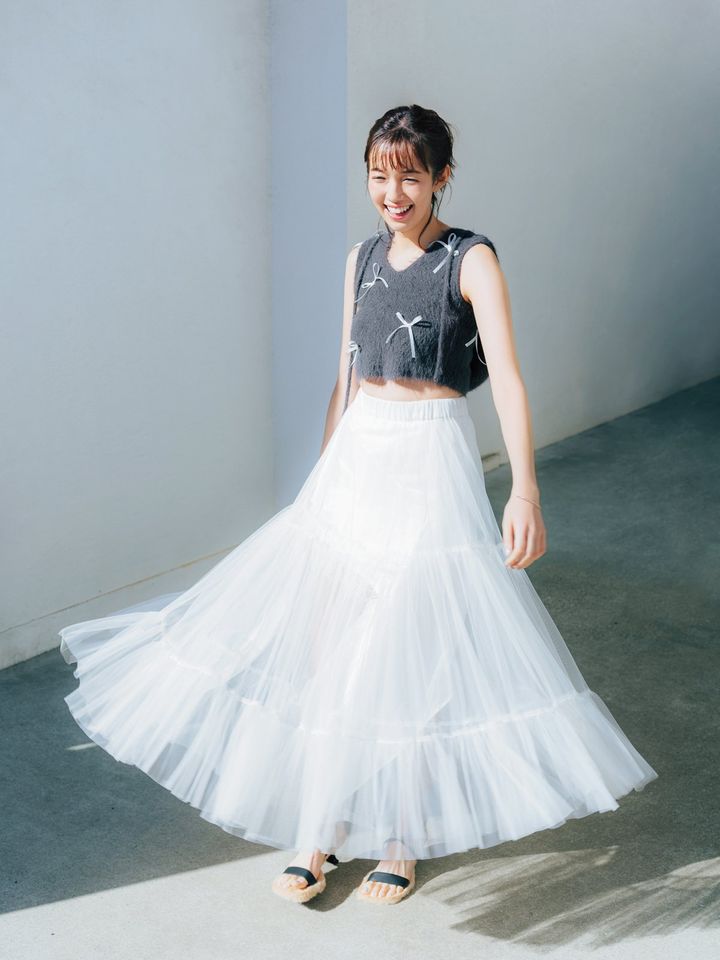ボトムは、マキシ丈の真っ白なチュチュスカートをチョイス。好きな人ができたトキメキを体現してくれるかのように、歩くたびふわっと広がる姿はとっても華やか♥モノトーンでまとめているので、やりすぎ感がないんです。