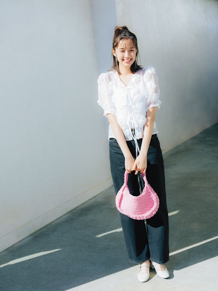 ブラックデニムを投入すればIラインで脚長効果にも期待できそう。ピンクのニットバッグを合わせて、コーデに彩りを添えるのが得策。