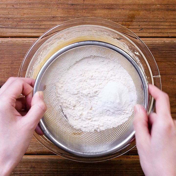 4: 薄力粉とベーキングパウダーをふるい入れ、切り混ぜます。