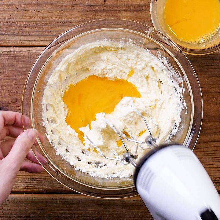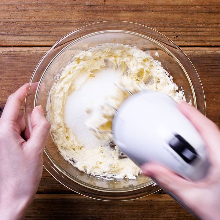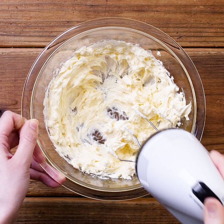 1: ボウルにバターとクリームチーズを入れ、クリーム状になるまで混ぜます。
