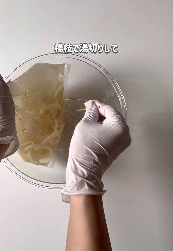 楊枝を使ってポリ袋に穴をあけ、受け皿として使用したボウルを使ってお湯を切ります。