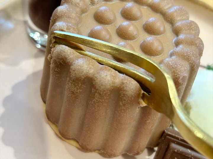 「A WORKS」のシグネチャーメニューであるチーズケーキを、薬菓の特徴であるスパイスを使用しつつ、ガーナチョコレートとマッチするようにアップデート。薬菓を模した形がインパクトある一品です。