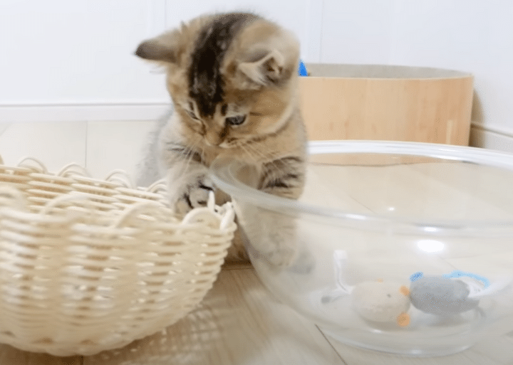 もどかしい! おもちゃを運び出そうと奮闘する子猫。