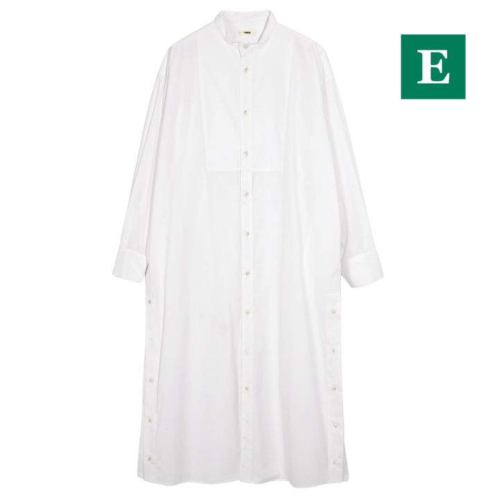 【ReNAVEの ロングシャツ】1枚でドレスとして、フロントをあけて羽織りとして、使い勝手抜群のロングシャツ。両サイドのボタンを外せばスリットも楽しめる。首元がスッキリ見えるバンドカラーも◎。ロングシャツ¥24,970(リネイヴ/ネイヴ)