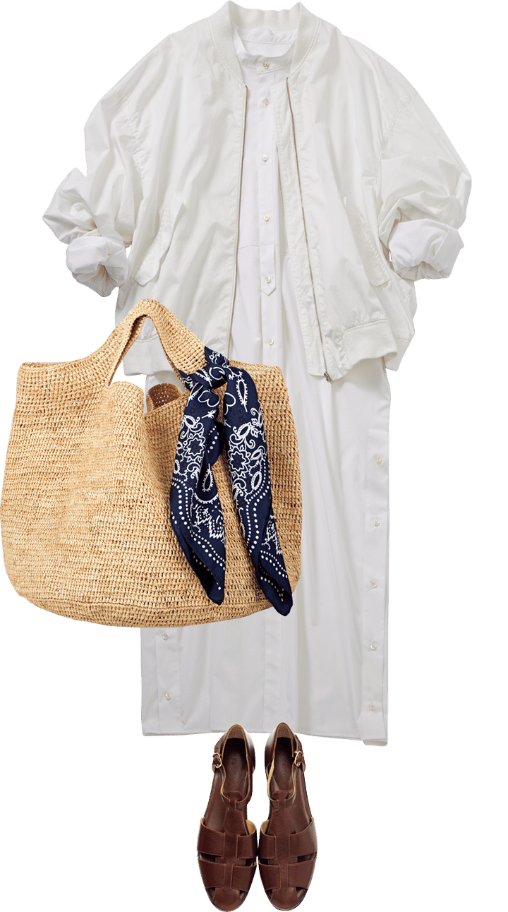 オールホワイトが春らしくクリーンなコーディネート。ホワイトにはついブラックを合わせてモードに振りがちだけれど、あえてブラウンやベージュ、ネイビーを差して、コンフィーなムードにドレスダウンするのもオススメ。