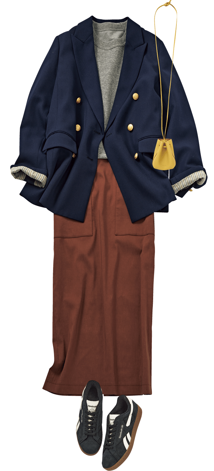 ネイビーとテラコッタがグッドバランスなカラーリング。ハンサムな紺ブレも、ボトムをタイトスカートにするだけで一気にレディな印象に。スエットとスニーカーのスポーツMIXが適度に力の抜けた大人カジュアルを実現。