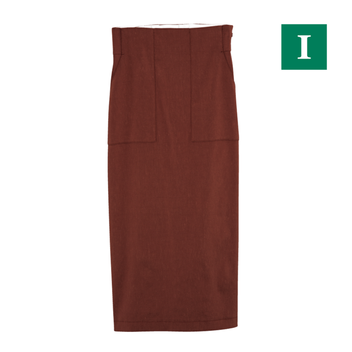 スタイルアップも叶えてくれるペンシルシルエットのスカートは、ストレッチ&バックスリット入りではきやすさも抜群。サラリとしたリネン混素材、テラコッタカラーが大人っぽい雰囲気。スカート¥19,800(ロペ)