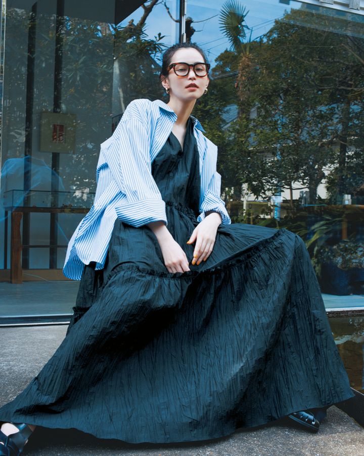 たっぷりとしたボリュームがロマンティックなドレスは、カジュアルなシャツを無造作に羽織ることでシティライクな雰囲気に。さらに眼鏡も相まって、ハンサムなムードも。ドレスの甘さをおさえたいなら、こんな風に異なるテイストを合わせて。