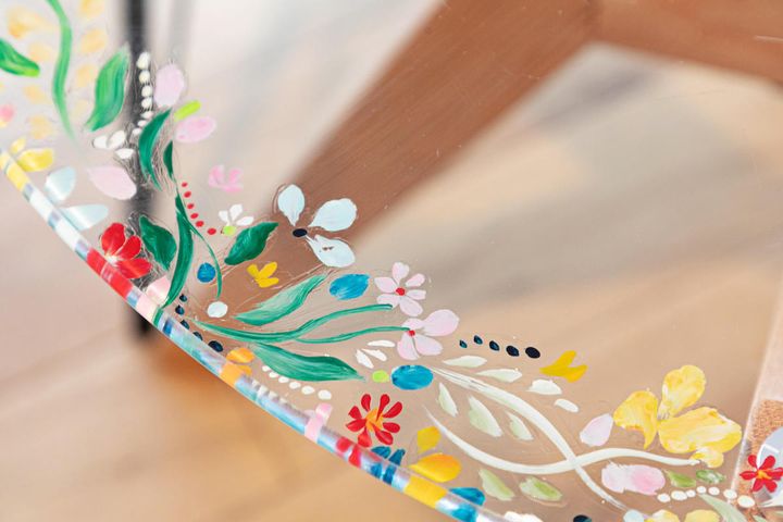 アーティストの倉中るなさんが手描きしたガラスのテーブル
