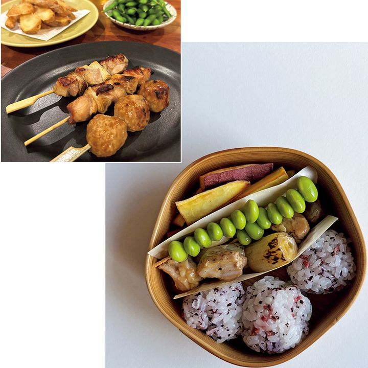 娘はザ・子ども向けのおかずよりも、居酒屋メニューが好き。前日の夜ご飯に作った焼き鳥や枝豆、フライドポテト(焼きさつま芋)をお弁当に入れています。枝豆も串に刺せば食べやすく楽しいし、一石二鳥。おにぎりだけは、サッと握ります。