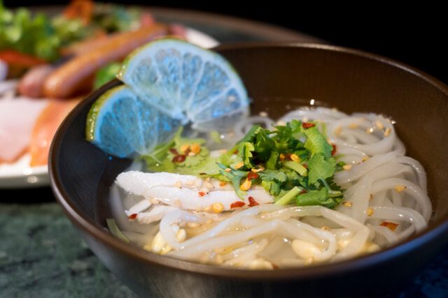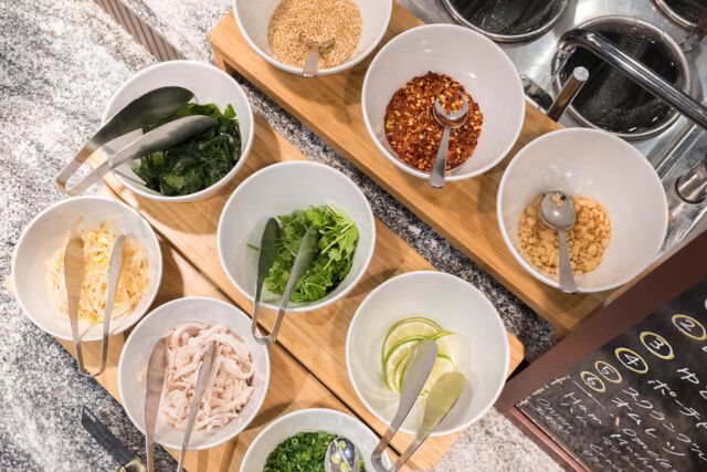 「フォー」や「うどん」用に鶏肉や葱、ワカメ、パクチー、ライムなどが用意され、お好みのトッピングを楽しめます。
