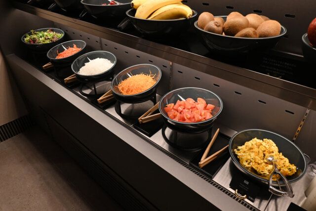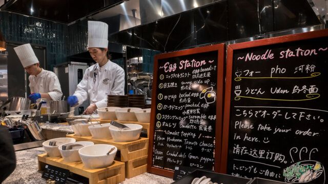 レストランの一画には、卵料理とフォーを作るライブキッチン「エッグステーション」と「ヌードルステーション」があります。エッグベネディクトやオムレツなどの卵料理をオーダーできて、卵の焼き加減も対応。麺料理は「フォー」と「うどん」を提供します。