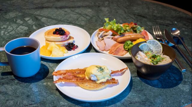 ビュッフェテーブルにはバラエティに富んだ和洋中の料理が並び、ライブキッチンはシェフが焼きあげるオムレツやエッグベネティクトの卵料理のほか、フォーなどのヌードルメニューを用意。朝食は6時30分から。宿泊者以外も、大人¥5,060円(税込)で食べられます。