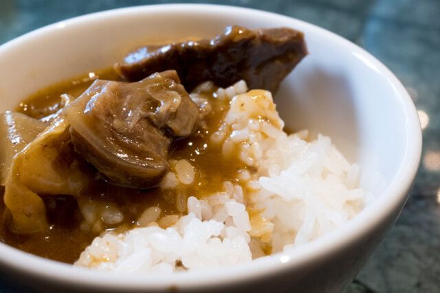 完成まで2、3日。手間暇かけたカレーには、じっくり煮込まれた牛筋がたっぷり。素材の旨味もギュッと詰まって、スパイス控えめの朝に優しいお味です。