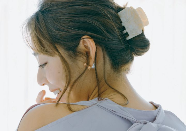 旬のヘアクリップを使った簡単&しゃれ見えするアップヘアは今っぽさもタイムパフォーマンスもばっちり!ただまとめるだけだと疲れて見えるので、計算されたおくれ毛でムードを演出して。