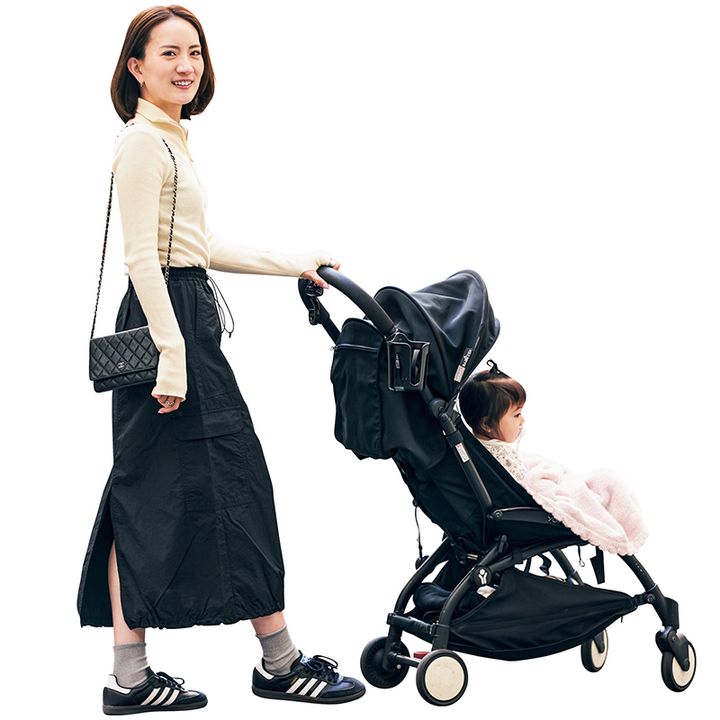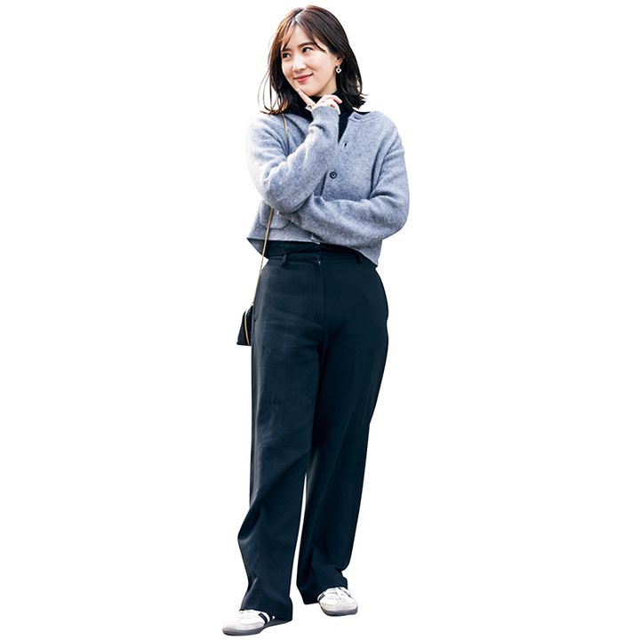 「コンサバ感は残しつつ、モードにも振れる名品! 洗濯機で洗えるうえに産後の体型カバーにもひと役買ってくれるいいこと尽くめ。穿くだけで〝今日、お洒落してる!〟と満たされるから、忙しない2人育児中の今欠かせない相棒です」