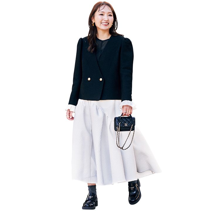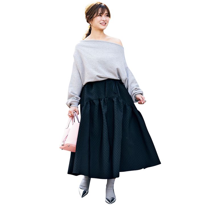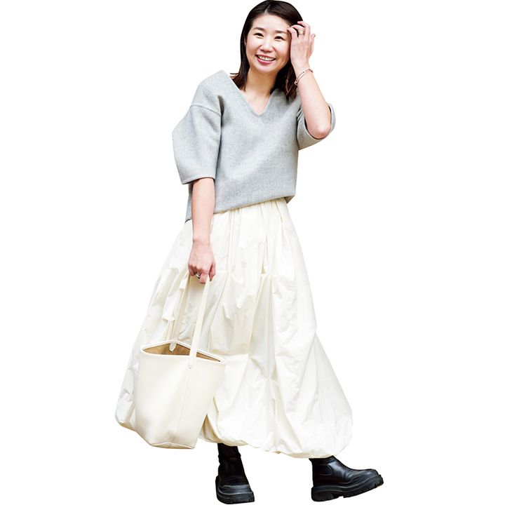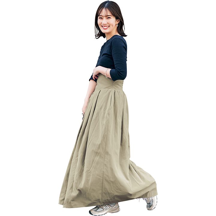 「動きやすさを優先して週6でパンツを穿いていますが、どうしてもマンネリするのが悩み。ボトムスをブルレアのスカートにシフトするだけで、華やかさが格段にUP! 歩くたびに動きの出るシルエットで、高揚感も味わえます」