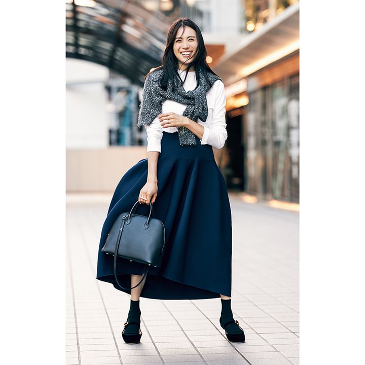 スカート¥49,500(サードマガジン)カットソー¥18,700(セント ジョンズ サード クラブ/アマン)バッグ¥92,400(メゾンヴァジック/ヴァジックジャパン)シューズ¥140,800(セルジオ ロッシ/セルジオ ロッシ カスタマーサービス)