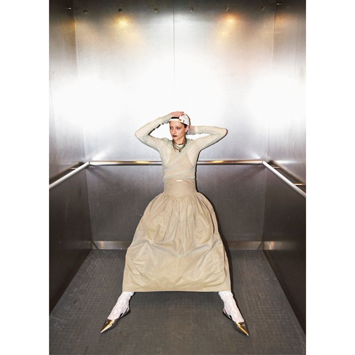 ジャガード生地の上にチュールが重なったボリューミィなシルエット。